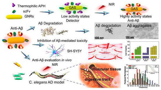 Neurodegenerative disease therapy: In addition to tumor therapy, enzyme-nanoparticle complexes show potential application for the therapy of neurodegenerative disease. Alzheimer’s disease, one of the most common neurodegenerative diseases, is caused by an abnormal accumulation of amyloid-β (Aβ) in different parts of the brain [59]. Therefore, great efforts have been made to develop theranostic strategies to degrade Aβ aggregates, including anti-Aβ aggregate agents, hyperthermia, and amyloid-degrading enzymes (ADEs) [60,61,62]. Based on this, our group designed a novel multifunctional anti-Aβ agent GNRs-APH-scFv (GAS) by combining AuNPs with an ADE (thermophilic APH ST0779) and modified it with a single-chain variable fragment (scFv12B4) that can target Aβ levels with high specificity (Figure 5) [41]. It is worth noting that the photothermal effect of the AuNPs upon NIR irradiation can activate not only thermozyme activity but also degrade the aggregates. Moreover, all the control groups, including APH and scFv alone, as well as the conjunction of APH and scFv, GNRs-APH, and GNRs-scFv, showed decreased degradation of Aβ fibril aggregation compared to GNRs-APH-scFv. This indicated that GAR-mediated hyperthermia and enzymatic therapy exhibited synergistic effects on dissociating Aβ aggregates and inhibiting Aβ-mediated toxicity. Thus, this GAR nanoplatform provided innovative prospects for biomedical theranostics for AD treatment.