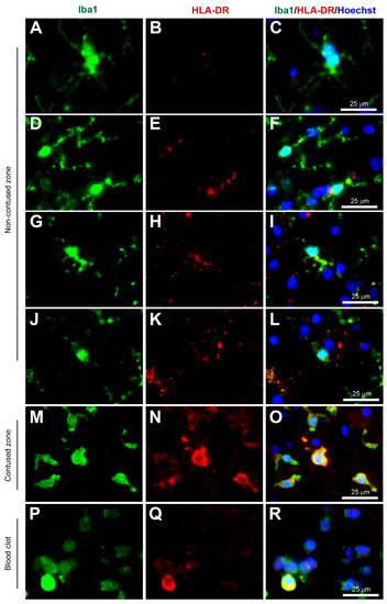 Coexpression of Iba1 and HLA-DR. Human brain biopsy samples from the superior frontal gyrus after TBI were stained with the primary antibodies: rabbit anti-Iba1 (1:1000, Wako, Cat No. 019-19741) and mouse anti-HLA-DR (1:500, Invitrogen, Cat No. MA5-11966) followed by rabbit anti-Alexa Fluor 488 and mouse anti-Alexa Fluor 594, respectively. Limited HLA-DR expression was observed in Iba1+ microglia with a ramified morphology (A–C), but strong HLA-DR expression in Iba1+ microglia in the activated state (D–L) in the non-contused brain tissue. Predominantly amoeboid microglia stained with Iba1 and HLA-DR were observed in contused brain tissue (M–O). Clotted blood from a neurosurgical (brain) operative field was used to identify a few peripherally-derived macrophages that strongly stained for both Iba1 and HLA-DR (P–R). Scale bars are 25 μm. Unpublished data.