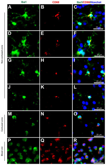 Coexpression of Iba1 and CD68. Human brain biopsy samples from the superior frontal gyrus after TBI were stained with the primary antibodies: rabbit anti-Iba1 (1:1000, Wako, Cat No. 019-19741) and mouse anti-CD68 (1:500, Invitrogen, Cat No. 14-0688-82) followed by rabbit anti-Alexa Fluor 488 and mouse anti-Alexa Fluor 594, respectively. Iba1+ microglia co-expressed with CD68 can be observed in various activated states, ranging from the most ramified state (A–C) through increasing states of activation (D–F and G–I) to the most amoeboid morphology (J–L) in the non-contused brain tissue. In contrast, predominantly amoeboid microglia stained with Iba1 and CD68 were observed in contused brain tissue (M–O). Clotted blood from a neurosurgical (brain) operative field was used to identify peripherally-derived macrophages that strongly stained for both Iba1 and CD68 (P–R). Scale bars are 25 μm. Unpublished data.