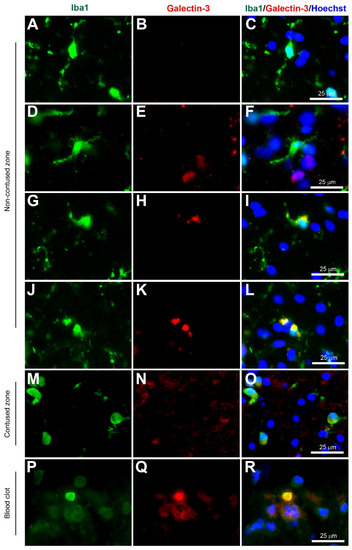 Galectin-3 is described as a carbohydrate-binding protein glycoprotein located in different cell and tissue types [45]. In normal conditions, the galectin-3 level in ramified microglia is low, but activated microglia have upregulated galectin-3 expression both intracellularly and outside the cell, which suggests that it plays a key role in the microglia’s immune response following TBI in rodents [46]. Furthermore, in this review, co-immunostaining with Iba1 (Wako, Alpha Laboratories Ltd, Cat. No. 019-19741) and galectin-3 (R & D Systems, Bio-Techne Ltd, Abingdon, UK, Cat. No. AF1197) showed low, if any galectin-3+ immunostaining in ramified microglia (Figure 3A–C), but it was increased in reactive microglia (Figure 3D–O) and macrophages (Figure 3P–R) (unpublished data). Since the immunostaining is predominantly in the cytoplasm, it is unable to label microglial processes. Interestingly, galectin-3 has been shown to control microglia morphology and phagocytosis [47]. However, there is evidence for the expression of galectin-3 in the nucleus and cytoplasm of macrophages [48], neutrophils, T-cells, and mast cells [49]. Therefore, using galectin-3 as a sole marker for microglia is limited due to low levels in normal conditions and lack of specificity, but can be used to determine the development of reactive microglia.