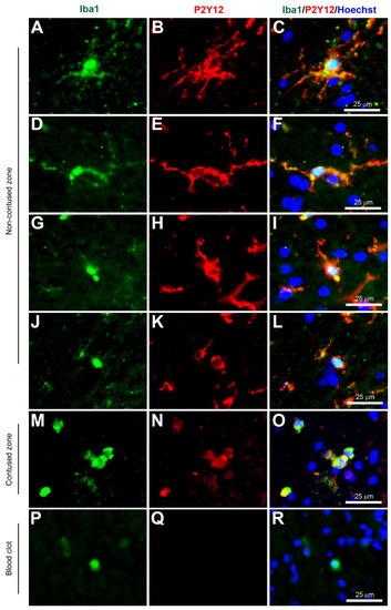 Coexpression of Iba1 and P2Y12. Human brain biopsy samples from the superior frontal gyrus after TBI were stained with the primary antibodies: goat anti-Iba1 (1:500, Novus Biologicals, Cat No. NB100-1028) and rabbit anti-P2Y12 (1:200, AnaSpec, ANA55043A) followed by goat anti-Alexa Fluor 488 and rabbit anti-Alexa Fluor 594, respectively. Strong coexpression was observed in Iba1+ microglia with P2Y12 in both ramified (A–C) and activated state (D–L) in the non-contused brain tissue. Predominantly amoeboid microglia stained with Iba1 and P2Y12 were observed in contused brain tissue (M–O). Clotted blood from a neurosurgical (brain) operative field was used to identify peripherally-derived macrophages that showed strong Iba1+ but lacked P2Y12+ immunostaining (P–R). Scale bars are 25 μm. Unpublished data.