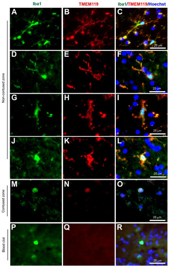 Coexpression of Iba1 and TMEM119. Human brain biopsy samples from the superior frontal gyrus after TBI were stained with the primary antibodies: goat anti-Iba1 (1:500, Novus Biologicals, Cat No. NB100-1028) and rabbit anti-TMEM119 (1:500, Abcam, Cat No. ab185333) followed by goat anti-Alexa Fluor 488 and rabbit anti-Alexa Fluor 594, respectively. Strong coexpression was observed in Iba1+ microglia with TMEM119 in both ramified (A–C) and activated state (D–L) in the non-contused brain tissue. Predominantly amoeboid microglia stained with Iba1 and TMEM119 were observed in contused brain tissue (M–O). Clotted blood from a neurosurgical (brain) operative field was used to identify peripherally-derived macrophages that showed strong Iba1+ but lacked TMEM119+ immunostaining (P–R). Scale bars are 25 μm. Unpublished data.