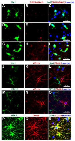 - Hendrickx, D.A.E.; van Eden, C.G.; Schuurman, K.G.; Hamann, J.; Huitinga, I. Staining of HLA-DR, Iba1 and CD68 in human microglia reveals partially overlapping expression depending on cellular morphology and pathology. J. Neuroimmunol. 2017, 309, 12–22. [Google Scholar] [CrossRef] [PubMed]