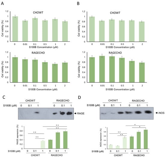 Cell viability, RAGE, and inducible nitric oxide synthase levels in CHOWT and RAGECHO cells—the model system to study changes in exS100B and RAGE-dependent intracellular S-nitrosylation. (A,B) The effects of 24 or 48 h treatment with exS100B on the CHOWT and RAGECHO cells’ viability. Cell viability measured using the methyl-thiazolyl diphenyltetrazolium bromide (MTT) method; (C) Western blot analysis of RAGE protein level after treatment of CHOWT and RAGECHO cells with different concentrations of exS100B. Blots are representative of three independent experiments. Bars show means ± SEM; * p < 0.05; ** p < 0.01; two-tailed t-test; (D) Western blot analysis and densitometric quantification of iNOS and RAGE protein levels after treatment of CHOWT and RAGECHO cells with different concentrations of exS100B. Blots are representative of three independent experiments. Bars show means ± SEM; * p < 0.05; ** p < 0.01; two-tailed t-test.
