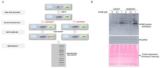 Protein S-nitrosylation in the CHOWT and RAGECHO cells (A). Schematic representation of protein S-nitrosylation analysis using the Biotin Switch Method; (B). Western blot analysis of protein S-nitrosylation in CHOWT and RAGECHO cells after treatment with 0.1 μM or 1.0 μM of extra-cellular S100B, and a whole-cell protein content in CHOWT and RAGECHO visualized by Ponceau S staining. Same intensities of GAPDH staining were the controls of sample loading.