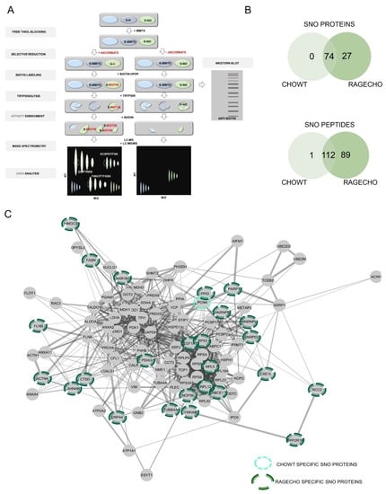 SNOSID analysis of basal protein S-nitrosylation in CHOWT and RAGECHO cells. (A) The experimental scheme of protein S-nitrosylation site analysis (SNOSID), (B) Venn diagrams comparing numbers of basal SNO proteins or SNO peptides identified for WTCHO and RAGECHO cells. (A) Schematic representation of a mass spectrometry-based approach for large-scale, site-specific S-nitrosylation analysis. Stable biotin derivatives substituted labile S-nitrosylation groups on cysteine thiols. After trypsin digestion, the biotinylated peptides were enriched on avidin resin and analyzed using MS in two independent runs (LC-MS and LC-MS/MS). MSparky allowed for site-specific data analysis; (B) Venn diagram comparisons of the numbers of SNO proteins and sites identified in CHOWT and RAGECHO cells; (C) String interaction network of all identified S-nitrosylated proteins. Light green marked are proteins, specifically SNO in CHOWT cells; dark green marked are proteins present only in the RAGECHO cell line.