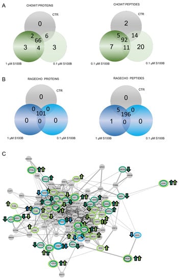 Impact of extracellular S100B treatment on the CHOWT and RAGECHO cells S-nitrosome. (A) Venn diagrams compare the numbers of SNO proteins identified in CHOWT after treatment with the low and high concentrations of S100B; (B) Venn diagrams compare the numbers of SNO proteins identified in CHOWT after treatment with low and high extracellular S100B; (C) String network analysis of all identified SNO proteins. Marked are S100B-induced SNO proteins in CHOWT and RAGECHO cells. Arrows reflects the direction of the change (upregulation and downregulation).