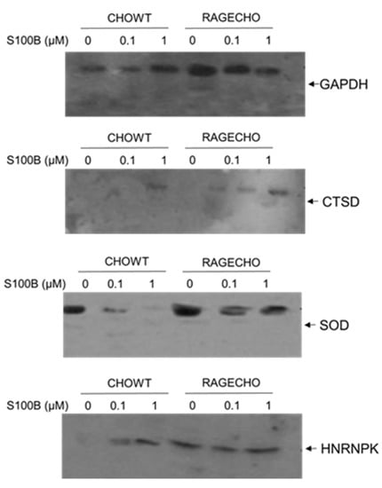 Protein-specific western blot validation of differentially S-nitrosylated in CHOWT and RAGECHO cells after treatment with 0.1 µM and 1.0 µM concentrations of S100B for glyceraldehyde dehydrogenase (GAPDH), cathepsin D (CTSD), superoxide dismutase 1 (SOD), and heterogeneous nuclear ribonucleoprotein K (HNRNPK).