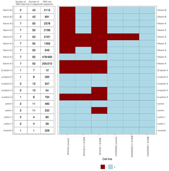 Proteins, specifically S-nitrosylated, depending on the concentration of exS100B used to treat CHOWT or RAGECHO cells.