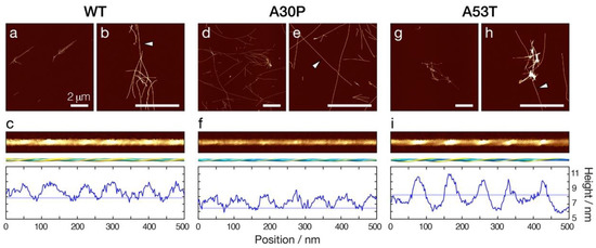 To investigate the impact of the disease-associated familiar point mutations A30P and A53T on the stability of α-synuclein amyloid towards fragmentation, WT, A30P, and A53T α-synuclein monomers were first assembled in vitro into amyloid fibrils under identical solution conditions at neutral pH (10 mM sodium phosphate buffer at pH 7.4). Under these solution conditions, twisted filaments morphologically typical for amyloid fibrils (Figure 1) were formed after two weeks’ incubation under gentle agitation in a shaker incubator at 180 rpm and 37 °C. Nano-scale imaging by atomic force microscopy (AFM) confirmed that all three α-synuclein sequences formed long, straight, and twisted fibrils that are similar to α-synuclein amyloid fibrils previously imaged by AFM [,,,]. Interestingly, all three amyloid fibril samples displayed considerable clustering of fibrils, with the A53T sample resulting in the most visibly apparent tangling and bundling of fibrils.