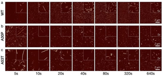 The dynamic stability of WT, A30P and A53T α-synuclein fibrils towards fragmentation was next probed by controlled sonication. We have previously employed stirring as the mechanical perturbation used to probe the relative fragmentation stability of different types of amyloid fibrils []. Controlled sonication is a method commonly used to rapidly fragment amyloid fibrils and for reproducibly generating amyloid seeds [,,]. Consequently, we employed controlled sonication as a rapid mechanical perturbation method to analyse the relative fragmentation stability of the three α-synuclein amyloid types. The three α-synuclein amyloid samples were treated under identical sonication regimes (see Methods section) for a period of time up to 640 s. Typical 2048 × 2048 pixel AFM height images covering 10 × 10 µm surface areas with fibril particles produced by the controlled sonication treatment of the samples for different lengths of time are displayed in Figure 2.