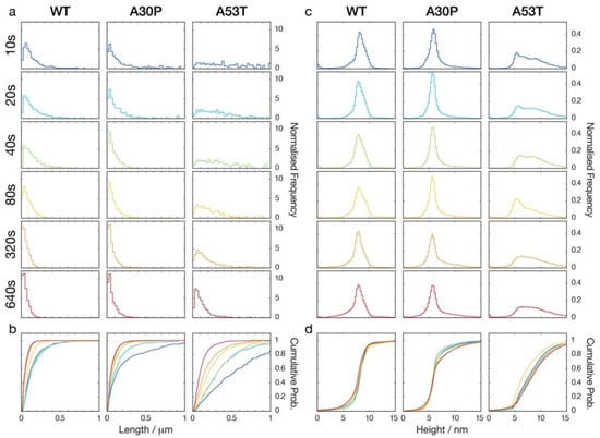 Fibril length and height distributions extracted from AFM images of the WT, A30P and A53T α-synuclein amyloid fibrils undergoing fragmentation by controlled sonication. Histograms representing normalised fibril length distributions (a) and height distributions (c) are shown using the same length and height scales, respectively, for comparison. Cumulative distribution functions of the same length distributions (b) and height distributions (d) are also shown to facilitate visualisation of the changes in the length distributions and the consistency of the height distributions for the duration of the controlled sonication. Statistics of the quantitative image analysis are shown in Supplementary Table S1.