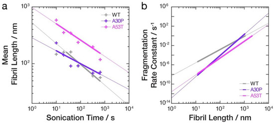 Comparative analysis of the relative stabilities of WT, A30P and A53T α-synuclein amyloid fibrils toward sonication-induced fragmentation. (a) The decay of experimentally observed mean lengths (+) as a function of sonication time duration is shown in a log–log plot together with the best-fit pure fragmentation model lines []. The thicker portion of the lines denotes the time ranges where the best-fit asymptotic lines describing characteristic length decay have likely been reached in the imaging experiments (the time ranges where the best-fit pure fragmentation model is likely reliable in describing the experimentally observed length decay, t > ts in Equation (1)). (b) The fragmentation rate constants, B(x), obtained from the best-fit pure fragmentation models are shown in a log–log plot as functions of fibril lengths, x. The thicker portion of the lines denotes the range of fibril lengths observed experimentally on the AFM images.