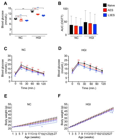 Treatment of six-week-old mice with excretory/secretory (ES) products derived from Nippostrongylus brasiliensis third-stage larvae (L3ES) or adult worms (AES) resulted in decreased fasting blood glucose (FBG), improved glucose metabolism and reduced weight gain in a high glycaemic index (HGI) model of type 2 diabetes. (A) FBG in mice fed on normal control (NC) diet or HGI diet and administered L3ES or AES. (B) Area under the curve (AUC) for oral glucose tolerance test (OGTT) data in mice fed on NC or HGI diets and administered L3ES or AES; (C) Blood glucose levels in mice fed an NC diet (C) or a HGI diet (D) and administered L3ES or AES. Body weight of mice fed an NC diet (E) or a HGI diet (F) and administered L3ES or AES. Statistical significance was determined with Student’s t-text or two-way analysis of variance (ANOVA). Data are expressed as means ± SD from 2 pooled experiments where n = 5/group for each experiment. Naïve vs. AES * (red asterisk), Naïve vs. L3ES * (blue asterisk), Naïve NC diet vs. Naïve HGI diet (black asterisk); * p < 0.05; ** p < 0.01. ns = not significant, p > 0.05.