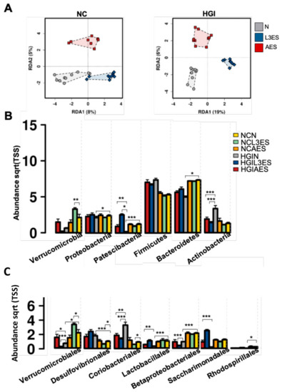 Multivariate analysis of differences in the microbial profiles in the small intestine of mice fed a normal control (NC) or high glycaemic index (HGI) diet and treated with excretory/secretory (ES) products from Nippostrongylus brasiliensis third-stage larvae (L3ES) or adult worms (AES): (A) Relative abundance of bacterial phyla in the small intestine of mice fed on NC or HGI diets and treated with L3ES or AES (B); Relative abundance of defined bacterial orders in the small intestine of mice fed a NC or HGI diet and treated with L3ES or AES (C). p-values are based on ANOVA-like differential expression analysis and are from 2 pooled experiments where n = 5/group for each experiment. * p < 0.05, ** p < 0.01, *** p < 0.001.