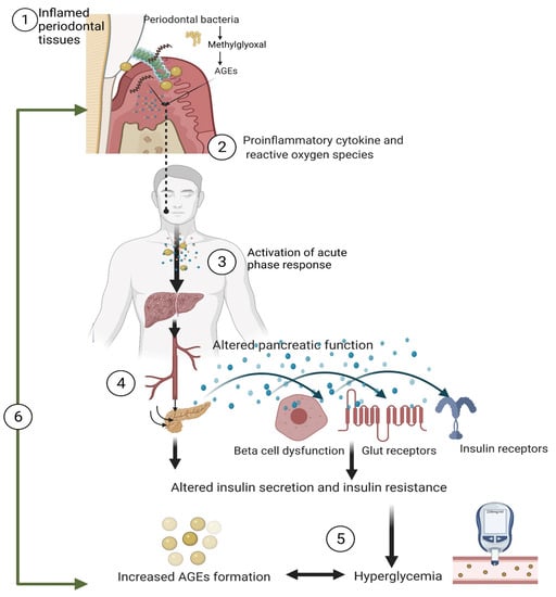(1) Periodontitis is caused by the interaction of the host with microorganisms in the oral biofilm. The host–microbial interaction causes a massive release of pro-inflammatory mediators (cytokines) and reactive oxygen species (ROS) in the gingival and periodontal tissues. Periodontal bacteria utilize the free glucose in the oral fluids and increase the production of the methylglyoxal synthase, an enzyme which catalyzes the formation of methylglyoxal, a precursor for advanced glycosylation end products (AGEs) and thereby increase the oxidative stress. (2) The locally produced pro-inflammatory chemical mediators, ROS, and microbial by-products along with AGEs enter the liver and activate the acute phase response that cause release numerous acute-phase proteins (such as C-reactive proteins). (3) The pro-inflammatory cytokines, acute phase proteins, and microbial products enter the pancreatic tissues and cause pancreatic dysfunction. (4) The cytokines—particularly interleukin 6, interleukin 12, and C reactive proteins—affect the insulin receptors, GLUT receptors, beta cells of the pancreas; reduce insulin secretion and increase insulin resistance which affect glucose uptake by cell and leads to hyperglycemia. (5) Reduced glucose uptake by the cell causes the excess glucose leading to glycation of host proteins and lipids, thereby forming more AGEs. (6) The increased AGEs levels interact with the insulin receptors, causing reduced insulin secretion and insulin resistance. The increase in the serum AGE levels via a vicious cycle increases oxidative stress, which, in turn, increases the severity of periodontal inflammation.