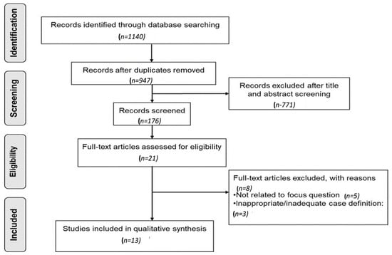 A total of 1140 articles were obtained from all databases (Figure 2 and Table 1). After removing the duplicates, 947 articles were retrieved and included for title and abstract screening. Upon title and abstract screening, 21 articles were included for full-text screening [,,,,,,,,,,,,,,,,,,,,]. After the full-text screening, 8 articles were excluded [,,,,,,,], because they did not relate to our PICO/focus question and case definitions were inadequately reported (Supplementary Table S1). Therefore, a total of 13 studies were included for the review [,,,,,,,,,,,,] (Table 2 and Table 3).