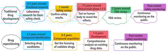 With the intense struggle between COVID-19 and mankind, there has been a growing number of investments and attention towards drug repositioning. Drug discovery is a time-consuming, expensive, and laborious process full of ups and downs []. It generally takes more than 10 years to develop a new drug, with a success rate of only 2.01% [,]. Traditional drug development mainly consists of five stages []: preclinical research, safety review, clinical trials, FDA review, and post-market safety monitoring. By comparison, drug repositioning provides more effective ways and alleviates the bottlenecks of time and cost for many countries. Figure 1 displays the whole comparison process []. In drug repositioning, the identification of potential drug–target interactions (DTIs) plays an extraordinary role in the early stage of drug development [,]. Luckily, with the accumulation of more targets, drugs, and their interaction data, various computational approaches have been developed and become accessible in recent years []. It is rather promising and valuable to extract and refine their merits to realize unique contributions of knowledge and accelerate the process of drug repositioning. Therefore, we propose Multi-TransDTI for more effective predictions of potential drug–target interactions.