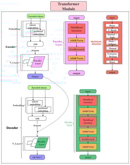 For the transformer module [], we encode each protein sequence based on SUPD and input the encoded tokens into this module for further protein feature extraction. The specific transformer architecture in our model is shown in Figure 4. We set the N_layers and N_Heads in this module to 4 and 5, respectively. In this part, MultiHead Attention increases the ability of the model to capture different local information and makes the final vector information wider, with the following formulas: