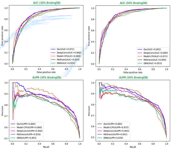 Model comparisons of AUC and AUPR on 30% and 50% BindingDB dataset (Our = MultiTrans-DTI).