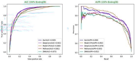 Our model achieves the best AUC and AUPR on 100% BindingDB dataset (Our = MultiTransDTI).
