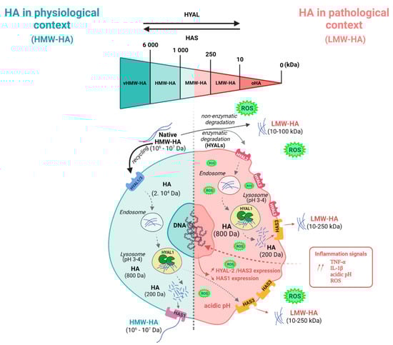 Catabolism and recycling of HA. In a physiological context, native HA (>1000 kDa) is mainly recycled by HYAL1 and HYAL3. Its intracellular degradation continues within lysosomal vesicles to reach a 200 Da size. HAS1 mainly performs the neo-synthesis of HMW-HA. In a pathological/inflammatory context, HMW-HAs are fragmented by ROS and HYAL (mainly HYAL2) to form LMW-HAs with a size between 10 and 250 kDa, then degraded into 200 Da-sized fragments in lysosomes. The neo-synthesis of LMW-HA (10–250 kDa) occurs through HAS3. Created with BioRender.com.