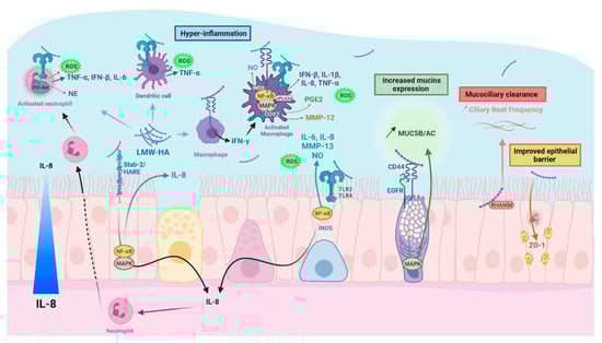 HA is a major component of the ECM. It is synthesized into HMW-Has, which exhibits anti-inflammatory functions. Under pathological conditions, HMW-HAs are degraded to give rise to LMW-HAs, which show pro-inflammatory properties. LMW-HAs are involved in innate immunity by activating associated cells, including neutrophils, macrophages, DC, and respiratory epithelial cells, thereby participating in lung protection. However, infection or inflammation may amplify the action of LMW-HAs via interactions with hyaladherins, leading to an increase in the secretion of cytokines (TNF-α, IFN-β, IL-6), chemokines (IL-8), ROS, or enzymes (NE, MMP-9, MMP-10, MMP-12). Although LMW-HAs may promote lung hyper-inflammation, they also have beneficial impacts on the airway epithelium. By increasing the CBF, they improve the mucociliary clearance, and, by modulating intercellular junction protein expression, they strengthen the integrity of the epithelial barrier. LMW-HAs exhibit a dual function in the lung, through the maintenance/amplification of inflammation and the protection of the lung epithelium (Figure 2). Regardless, the presence of LMW-HAs in the lungs/bronchial secretions correlates with the onset of pulmonary diseases. The most recent example is the detection of LMW-HA in respiratory secretions collected from intubated patients with COVID-19 and cadaveric lung tissues from COVID-19 patients []. Therefore, LMW-HA must be considered as a marker of lung inflammation in respiratory diseases that could be targeted in future therapeutics.