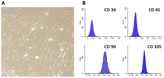 Characterization of isolated BM-MSCs. (A) Isolated BM-MSCs in culture at passage 3 with the typical fibroblast-like shape. (B) Flow cytometric evaluation of BM-MSCs markers seen as a positive expression of CD90 and CD105, and negative expression of endothelial CD34 and hematopoietic CD45 markers.