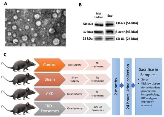 Recently, studies have elucidated that mesenchymal stem cells (MSCs) possess therapeutic capabilities for many diseases, mainly through their paracrine mechanisms [12,13,14]. These paracrine actions are mediated by the release of soluble factors and encapsulated factors (inside microvesicles and exosomes). The latter is of special importance since exosomes released from MSCs are responsible for the horizontal transfer of important mRNA, microRNA and proteins and are now being recognized as an integral component of intercellular communication [15,16,17]. Exosomes are ideal therapeutic agents because their complex content of proteins and genetic materials has the potential to treat complex diseases, such as CKD. In addition, exosome-based therapy circumvents some of the concerns and limitations of using viable replicating cells, including mesenchymal stem cells [18]. One of the main contributors to kidney regeneration is stem cells that reside in the kidney itself (reviewed in [19]). However, isolated stem cells from animals suffering from CKD showed decreased regenerative potential and premature senescence [20]. The latter study shows that during CKD, the kidney regenerative capacity was not functioning properly and contributes to advancing chronic kidney damage. Very recently, adipose MSCs and their secreted vesicles were found to be beneficial in protecting against ischemia-reperfusion acute kidney failure [21]. However, there is a global concern about using viable replicating cells, and much clinical investigation is still needed; therefore, stem cells’ secreted exosomes come as a promising cure for diseases with complex etiology, such as CKD in postmenopausal females. In this regard, exosomes used for treating acute kidney injury have drawn recent attention [22,23,24]. In addition, few studies reported the use of exosomes for treating chronic kidney injury (reviewed in [25]).