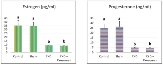 Changes in serum estrogen and progesterone levels in study rats. CKD + Exosomes group received an intravenous injection of 100 µg protein-equivalent of exosomes in their tail vein. Different letters denote statistical significance (p < 0.05, using Tukey’s HSD post-hoc test).