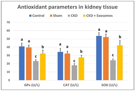 Antioxidant parameters in kidney tissue, glutathione peroxidase (GPx), catalase (CAT) and superoxide dismutase (SOD) in the different study groups. The CKD + Exosomes group received an intravenous injection of 100 µg protein-equivalent of exosomes in their tail vein. Columns with different letters denote significant differences between groups (p < 0.05, using Tukey’s HSD post-hoc test).