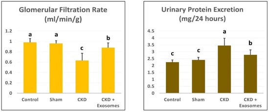 Changes in glomerular filtration rate (GFR) and urinary protein excretion in the different study groups. The CKD + Exosomes group received an intravenous injection of 100 µg protein-equivalent of exosomes in Their tail vein. Columns with different letters denote significant differences between groups (p < 0.05, using Tukey’s HSD post-hoc test).