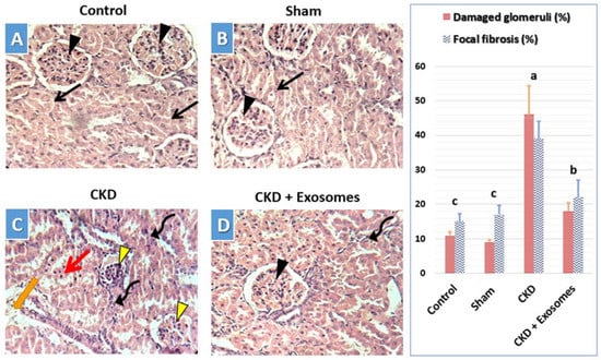 Representative micrographs for the histological evaluation of the lesions in the kidneys of different studied groups. (A) Control group, (B) Sham group, (C) CKD group, and (D) CKD + Exosomes group; The CKD + Exosomes group received an intravenous injection of 100 µg protein-equivalent of exosomes in their tail vein. Black arrow head = normal glomeruli, Yellow arrow head = shrunken glomeruli with degenerated glomerular cells, wide intraglomerular space and edema in some glomeruli, Black arrow = normal renal tubules, Red arrow = degenerated renal tubular epithelial cells, Orange arrow = fibrosis, and Curved arrow = mononuclear cells infiltration. The right bar graph shows the percentage of damaged glomeruli (shrunken with/without edema) and the percentage of focal fibrosis in the different study groups, columns with different letters denote significant differences between groups (p < 0.05, using Tukey’s HSD post-hoc test).