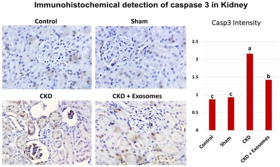 Representative micrographs showing the expression of caspase 3 in kidney tissue by immunohistochemistry in the different studied groups. The CKD + Exosomes group received an intravenous injection of 100 µg protein-equivalent of exosomes in their tail vein. The right bar graph shows the intensity of caspase 3 staining in the different groups, columns with different letters denote significant differences between groups (p < 0.05, using Tukey’s HSD post-hoc test).