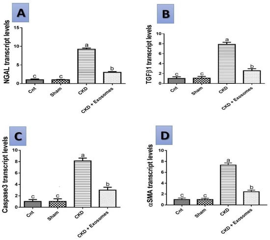 Changes in the mRNA expression of (A) neutrophil gelatinase-associated lipocalin (NGAL), (B) transforming growth factor beta 1 (TGFβ1), (C) caspase 3 and (D) smooth muscle alpha-actin (αSMA) genes in the different studied groups. The CKD + Exosomes group received an intravenous injection of 100 µg protein-equivalent of exosomes in their tail vein. Columns with different letters denote significant differences between groups (p < 0.05, using Tukey’s HSD post-hoc test).