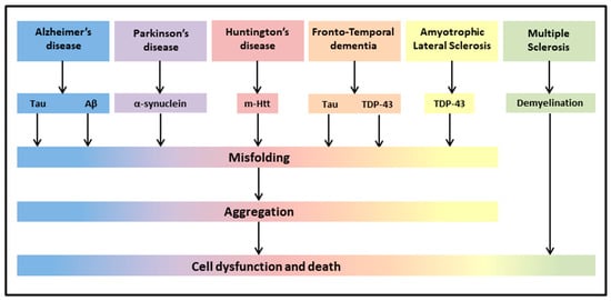 The most common neurodegenerative diseases encompass a wide range of conditions which impair mobility, muscle coordination and strength, mood, and cognition. They are amyloidosis, tauopathies, α-synucleinopathies, proteopathies (TAR DNA-binding protein 43, TDP-43), and include Alzheimer’s Disease (AD), Parkinson’s Disease (PD), Huntington’s Disease (HD), Frontotemporal Dementia (FTD), Amyotrophic Lateral Sclerosis (ALS), and Multiple Sclerosis (MS) (Figure 1) [43].