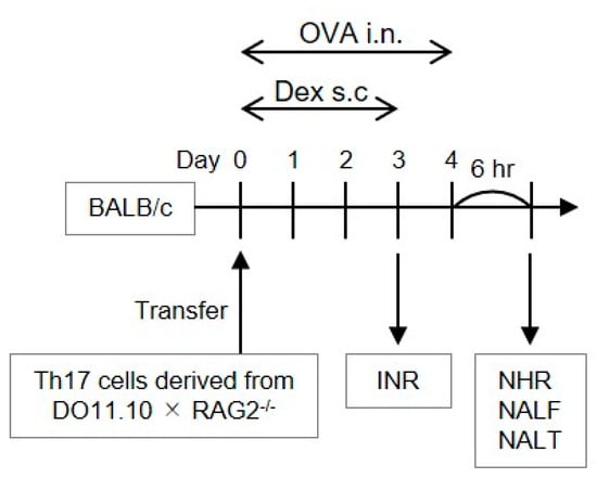 Each seven- to eight-week-old female BALB/c mouse (Charles River Laboratories Japan, Kanagawa, Japan) was intravenously injected with the polarized Th17 cells (2 × 107) on day 0 (Figure 1). Six hours later, these mice received daily injection of 20 μL OVA (30 mg/mL; Sigma, St. Louis, MO, USA) or phosphate-buffered saline (PBS) through the intranasal route on days 0–4 (Figure 1). INR was evaluated on day 3 by the count of sneezes measured for 5 min immediately following the OVA challenge. NHR was evaluated 6 h following the final OVA injection on day 4 by the count of sneezes measured for 5 min immediately after the injection of 10 μL histamine (100 mM; Nacalai tesque, Kyoto, Japan) []. Nasal lavage fluid (NALF) and NALT were subsequently collected. We classified inflammatory cells recovered in the NALF by referring the morphological criteria as described previously []. This procedure did not elicit any inflammatory features in the lungs []. Nasal OVA challenge to mice without allergen-specific Th cell transfer did not induce any inflammatory response []. In some assessments, mice were injected subcutaneously with 2.5 or 10 mg/kg Dex (Tokyo Kasei, Tokyo, Japan) which was suspended in PBS containing 0.5% Tween-20 (Sigma) 30 min prior to each allergen challenge on days 0–3. To evaluate the effect on NHR developmental process but not on direct influence on histamine-induced sneezing response, Dex was not administered on day 4. Although steroids are normally administered in the nose of AR patients, our procedure enabled us to compare the pharmacological effect of Dex with that we previously obtained in Th2 cell-transferred mice [], without concerning its distribution following administration. Vehicle alone displayed no effect on any experimental parameter evaluated in this study.