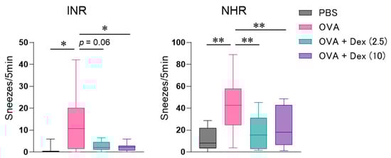 Effect of dexamethasone (Dex, 2.5 or 10 mg/kg) on allergen-induced immediate nasal response (INR) and nasal hyperresponsiveness (NHR) in Th17 cell-infused mice. INR was assessed by the count of sneezes measured for 5 min immediately after ovalbumin (OVA) challenge on day 3. NHR was assessed by the count of histamine-induced sneezes 6 h following the final OVA injection on day 4. Data are displayed as the box plot of 5–14 mice. PBS, phosphate-buffered saline. * p < 0.05, and ** p < 0.01, compared with OVA-injected mice (pink bar).