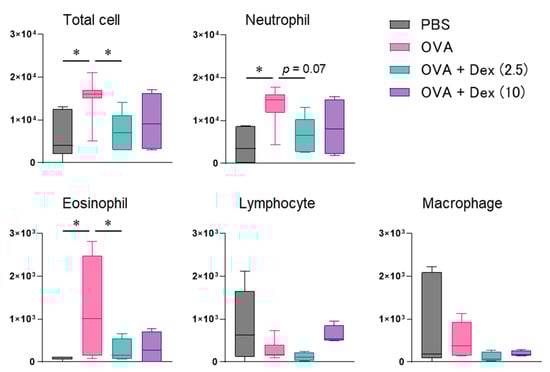 Effect of dexamethasone (Dex, 2.5 or 10 mg/kg) on allergen-evoked nasal cell infiltration in Th17 cell-infused mice. Inflammatory cell numbers in nasal lavage fluid (NALF) were measured 6 h following the final ovalbumin (OVA) injection. Data are displayed as the box plot of 4–7 mice. PBS, phosphate-buffered saline. * p < 0.05, compared with OVA-injected mice (pink bar).