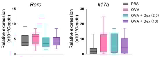 Retinoic-acid-receptor-related orphan receptor γt, an isoform of transcription factors coded in the Rorc gene [], is crucial for the development of Th17 cells and transcription of Th17-specific cytokines, IL-17A and IL-17F []. IL-17A is involved in Th17-mediated allergic inflammation []. Elevated IL-17A expression was detected in the airway biopsy specimens and sputa from patients with moderate-to-severe asthma [,]. IL-17A directly raised the contractility of airway smooth muscles in humans and mice []. Administration of an anti-IL-17A antibody mitigated airway inflammation with hyperresponsiveness elicited by house dust mites in mice [].