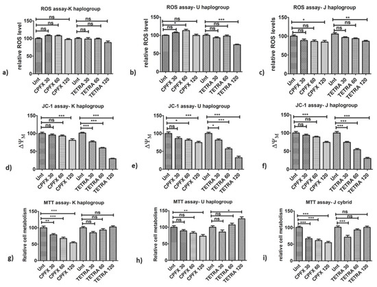 Impacts of CPFX and TETRA on ROS levels, ΔψM and cellular metabolism of K, U and J cybrids via ROS, JC-1 and MTT assays. (a) no changes in ROS levels via neither antibiotics in K cybrids; (b) CPFX 60 µg/mL increased ROS levels in U cybrids and diminished via TETRA 120 µg/mL; (c) ROS levels reduced by CPFX and TETRA 120 µg/mL in J cybrids; (d) CPFX 120 µg/mL and all TETRA treatments reduced ΔψM in K cybrids; (e) ΔψM diminished via CPFX 60 and 120 µg/mL and all TETRA concentrations in U cybrids; (f) CPFX 120 µg/mL along with all TETRA concentrations decreased ΔψM in J cybrids; (g) Diminished cellular metabolism with all CPFX concentrations in K cybrids; (h) CPFX 120 µg/mL reduced cellular metabolism of U cybrids but higher level with TETRA 120 µg/mL; (i) All CPFX treatments and TETRA 30 µg/mL declined cellular metabolism of J cybrids. (* p < 0.05, ** p < 0.01, *** p < 0.0001).
