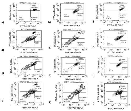 We investigated whether apoptotic cell death contributes to the negative impact of antibiotics on the different haplogroup cybrids. In K cybrids, treatment with 120 µg/mL of CPFX induced 100% value dead cells (p < 0.0001), versus 9.53% dead cells induced by vehicle-control treatment (Figure 2a,d). The TETRA-treated cells showed 18.66% (p < 0.05) dead cells versus 15.98% for the vehicle-control treated cells (Figure 2g,j). In U cybrids, there was no significant alteration of the ratio of dead cells with neither CPFX (17.81%) (Figure 2b,e) and TETRA (25.12%) (Figure 2h,k) versus HCl (15.64%) and Meth (23.61%)-exposed cells, respectively. Compared to vehicle-control-exposed cells, the J cybrids treated with CPFX 120 µg/mL showed a substantial increase in relative dead cells (90.52% versus 25.40%) (p < 0.05) (Figure 2c,f). The TETRA-treated cells also showed an increase in dead cells (16.36% versus 6.47%) (p < 0.05) compared to vehicle-control treated cells (Figure 2i,l). Therefore, CPFX and TETRA significantly increase the proportion of apoptotic and finally dead cells.