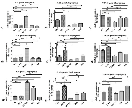 Changes in pro-inflammatory gene expression by CPFX and TETRA in K, U and J cybrids. In K Cybrids, (a) overexpression of IL-6 via TETRA, (b) higher IL-33 expression via CPFX; (c) and higher TGF-β1 expression via CPFX (c). In U cybrids, (d) higher IL-6 expression via TETRA, (e) higher IL-33 expression via CPFX and (f) upregulation of TGF-β1 via CPFX. In J Cybrids, (g) lower expression of IL-6 via CPFX, (h) upregulation of IL-33 via CPFX; (i) and downregulation of TGF-β1 via TETRA. (* p < 0.05, ** p < 0.01, *** p < 0.0001).