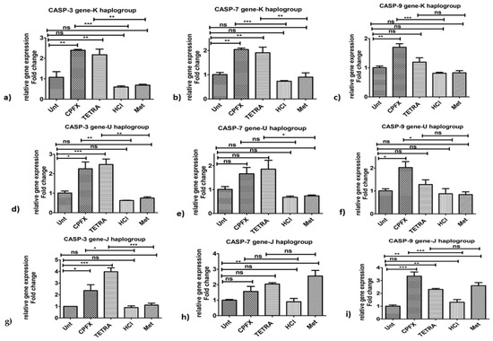 Alterations of pro-apoptotic genes induced by CPFX and TETRA in K, U and J cybrids. Overexpression of CASP-3 (a,d,g) via CPFX and TETRA in all three cybrids and upregulation of CASP-7 via CPFX and TETRA in K haplogroup (b) and overexpression of CASP-7 by TETRA in U cybrids (e,h) and higher CASP-9 (c,f,i) expression by CPFX in all three cybrids. (* p < 0.05, ** p < 0.01, *** p < 0.0001).