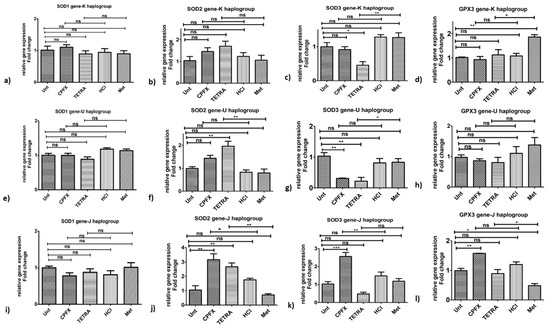 Antioxidant genes: The CPFX-treated J cybrids showed substantial overexpression of SOD2 (p < 0.05) (Figure 5j) and SOD3 (p < 0.01) (Figure 5k) along with no alteration of SOD1 (Figure 5i) and GPX3 (Figure 5l), respectively, compared to vehicle-control samples. The TETRA treatment induced a higher expression level of SOD2 (p < 0.01) (Figure 5j) and GPX3 (p < 0.05) (Figure 5l) genes but no alteration of expression level of SOD1 (Figure 5i) and SOD3 genes (Figure 5k).