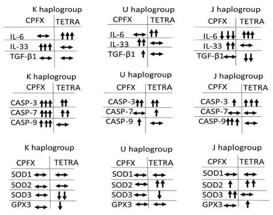Expression studies after TETRA treatment: Our findings showed cybrids treated with TETRA 120 µg/mL had (i) up-regulation of IL-6 and CASP-3 levels in all haplogroups; but (ii) down-regulation of IL-33 and SOD3 genes in K and U haplogroup cybrids. Ahler et al. studied the impacts of doxycycline on alteration of proliferation and metabolism of multiple human cell lines in vitro, such as cervical cancer cells (Hela), lung cancer cells (H157) and prostate cancer cells (LNCaP). There was a widespread alteration of expression of genes associated with the oxidative metabolic pathway along with dominancy of the glycolytic metabolism pathway [50]. They examined expression levels of genes associated with gluconeogenesis (fructose-1,6-bisphosphatase (FBP) and glucose-6-phosphatase (G6PC)) along with regulatory enzymes of the glycolysis pathway (pyruvate kinase (PK), hexokinase (HK) and phosphofructokinase (PFK)). They reported downregulation after TETRA treatment of the G6PC and FBP genes, along with upregulatory effects on PK gene levels [49]. In our study, the principal enzymes related to the antioxidant pathway were affected by treatments. TETRA 120 ug/mL induced downregulation of SOD2 expression in U and J haplogroups along with lower expression of GPX3 in exposed K haplogroups. Noteworthily, Jones et al. reported the importance of the disruptive role of tetracyclines in individuals with mitochondrial defects. The fibroblast cells derived from four categories of patients with defective mitochondrial diseases were exposed to doxycycline (10 µg/mL) or tetracycline (77 µg/mL). There was significant disruption of mitochondrial translation resulting from exposure to these antibiotics [50].