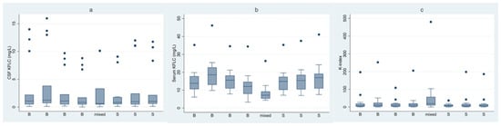 Box-plots showing median (±IQR) CSF (a) and serum (b) KFLC concentrations (mg/L), and K-index (CSF KFLC/Serum KFLC)/(CSF Albumin/serum Albumin) values (c) of the 15 samples across laboratories using Binding Site instruments and assays (B), Siemens instruments and assays (S) or a Siemens instrument coupled with a Binding Site assay (mixed). Upper whiskers show the upper adjacent value (UAV) (largest observation ≤ (third quartile + 1.5 × IQR)); lower whiskers show the lower adjacent value (LAV) (smallest value ≥ (lower quartile − 1.5 × IQR)); black dots show outliers (greater than the UAV or lower than the LAV).