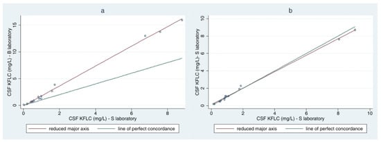 Lin’s concordance correlation coefficient for CSF KFLC measurements in the least concordant (a) pair of laboratories (0.769 (95%CI: 0.666–0.873)) and in the best concordant pair (b) (0.997 (95%CI: 0.994–0.999)).