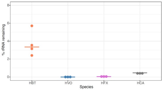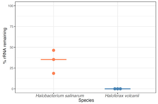 Percentage of rRNA remaining in halophile RNA by using the discontinued Ribozero kit (RZ). Each dot denotes one sample, with light orange dots representing Hbt. salinarum and blue dots representing Hfx. volcanii samples. Horizontal bars represent the median percentage of rRNA remaining.