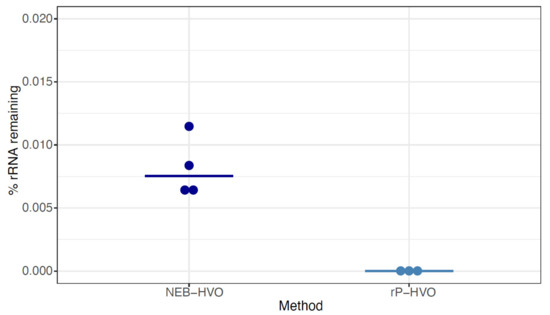 Having shown the importance of probe sequence specificity, we next tested two different methods with rRNA probes targeted to HVO against HVO total RNA samples: (a) NEBNext Core Reagent Set (“NEB-HVO” method); and (b) the siTools RiboPool kit (“rP-HVO”). Unlike the enzymatic NEB-HVO method, rP-HVO uses streptavidin-based removal of rRNA hybridized to biotinylated probes. For both methods, we used probes custom designed to be specific to HVO rRNA sequences (see Methods). We observed that both methods achieved nearly complete rRNA removal: median values of 0.008% and 0.000008% rRNA remaining were observed using NEB-HVO and rP-HVO methods, respectively (Figure 5; Table S1). These results with near-complete rRNA depletion in HVO with species-specific probes is in line with the observations above: the limiting factor with these probe-based methods is the identity of probe sequences with target rRNA sequences. Overall, we found that using probes targeted to HVO with either method resulted in efficient and near-complete removal of rRNA from HVO samples.